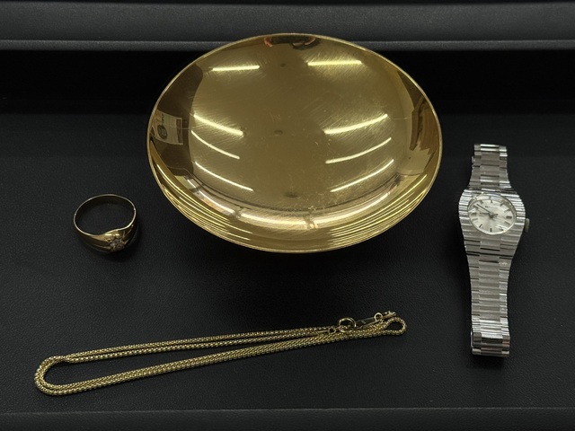 純金の金杯、K18アクセサリー、ラドーの時計をお買取させていただきました。